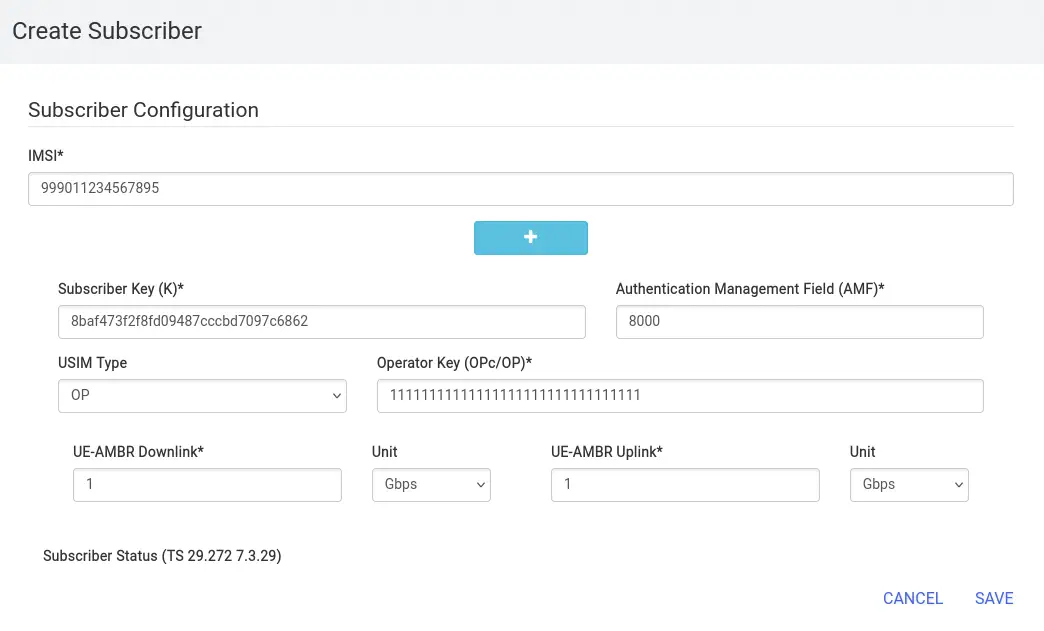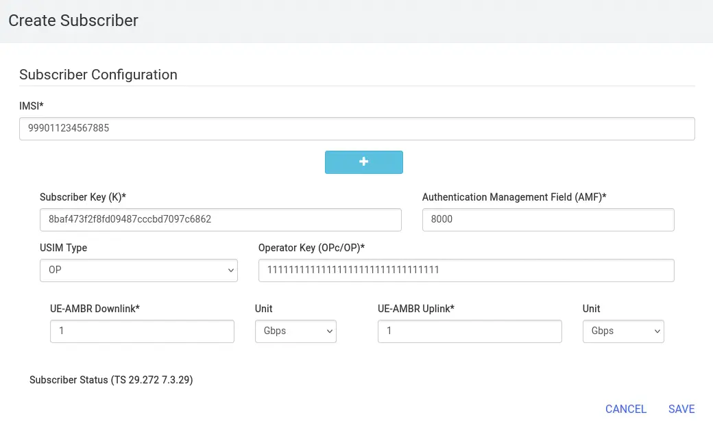 Iniciamos sesión en el panel web y añadimos el suscriptor mediante el botón ADD A SUBSCRIBER. Rellenamos el IMSI con UE1_IMEI, la Subscriber Key (K) con UE1_KI, la USIM Type con OP y la Operator Key (OPc/OP) con UE1_OP. Pulsamos en SAVE y volvemos a desplegar el UE.