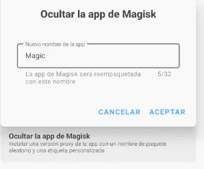 Luego configuraremos Magisk para que las aplicaciones no puedan detectarlo y bloquear su ejecución. Primero, en la configuración seleccionaremos la opción Ocultar la app de Magisk, e introduciremos un nombre aleatorio. Esto hará que Magisk se reinstale con un nombre de paquete aleatorio.