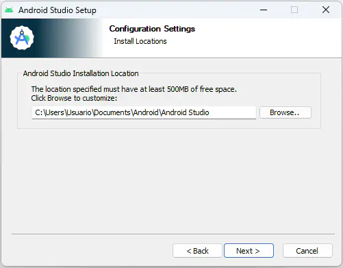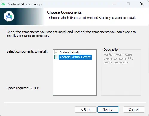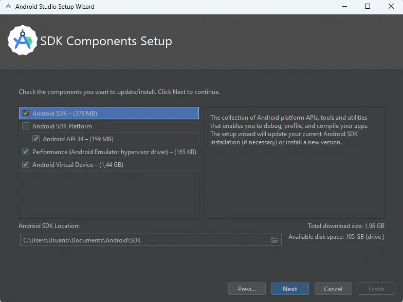 Para el emulador de Android, hemos elegido el IDE oficial de Android, Android Studio, que incluye soporte para dispositivos virtuales de Android (AVD). Para instalar el IDE simplemente nos dirigimos a su sitio web oficial, y podremos descargar el instalador aceptando los términos de licencia. En el proceso de instalación, al seleccionar los componentes a instalar, deseleccionaremos la opción Android Virtual Device, ya que la configuraremos posteriormente. En este caso instalaremos el IDE en nuestro directorio de Documentos.