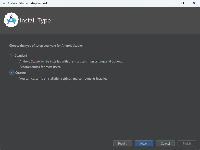 A continuación ya podremos iniciar Android Studio eligiendo la opción de no importar la configuración. Nos aparecerá un asistente en el que seleccionaremos una instalación personalizada.