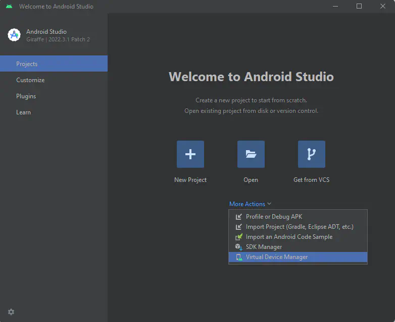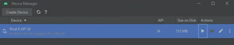 Después volviendo a Android Studio pulsaremos el enlace More Actions y abriremos el Virtual Device Manager, el administrador de máquinas virtuales de Android, en el que encontraremos una máquina virtual ya creada.