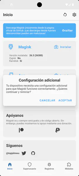La máquina se apagará y al reiniciarla tendremos la aplicación de Magisk instalada. Al abrirla nos indicará que el dispositivo necesita una configuración adicional, aceptaremos seleccionando el método de Instalación directa y se reiniciará el dispositivo. En ocasiones el mensaje seguirá apareciendo después del reinicio, solamente habrá que ignorarlo ya que en la aplicación se indica que Magisk se encuentra instalado.
