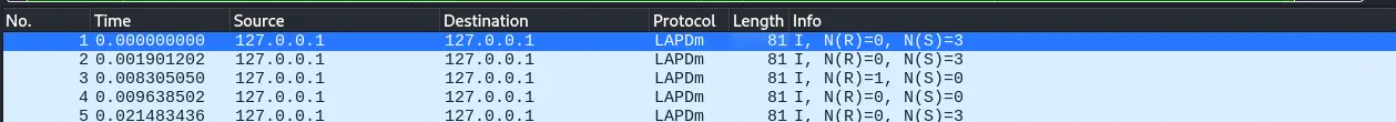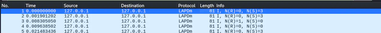 También especificaremos el intervalo de tiempo con -t (del 0 al 7, ya que GSM usa TDMA, lo cual permite que varios usuarios compartan el mismo canal de frecuencia dividiendo el tiempo de transmisión en intervalos). Especificamos el archivo con la captura con -c junto a su ARFCN con -a y su tasa de muestreo -s. Los paquetes podrán ser observados con Wireshark como anteriormente.
