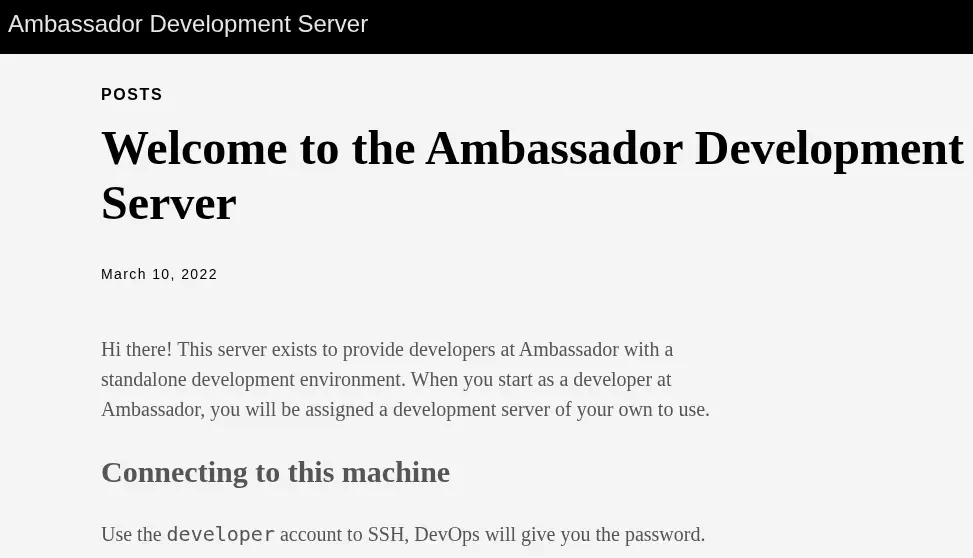 En el puerto 80 encontramos el servidor de blog estático del Ambassador Development Server con un artículo: Welcome to the Ambassador Development Server.