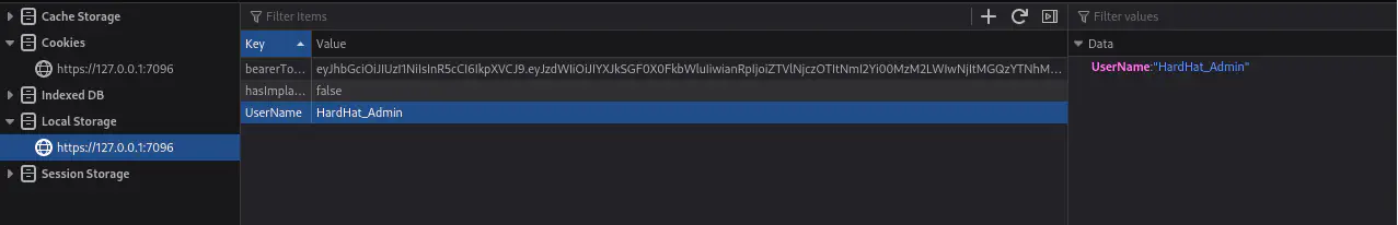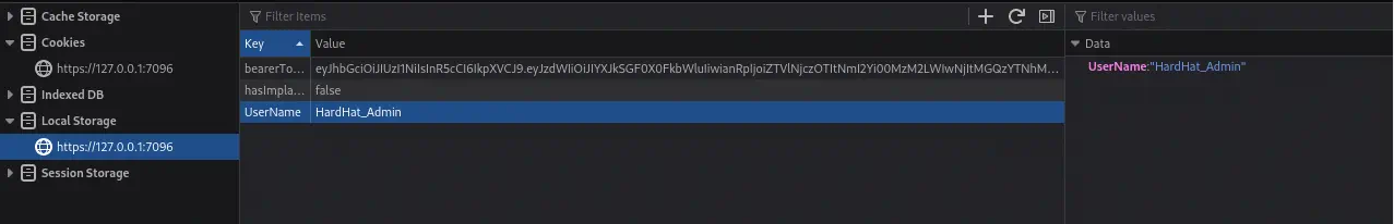 Si exploramos el código fuente de HardHatC2, en el archivo HardHatC2Client/Pages/Login.razor, se encuentran dos variables de almacenamiento local utilizadas para mantener una sesión en la página web bearerToken con el token generado y UserName con el nombre de usuario.️