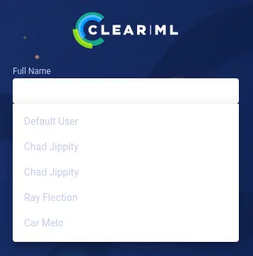 Si tomamos un minuto para revisar el sitio web en nuestro navegador, encontramos la página de inicio de sesión del software ClearML, una suite de desarrollo y producción para inteligencia artificial (IA) y aprendizaje automático (ML). Pudimos iniciar sesión escribiendo cualquier nombren el campo Full Name. Uno de los usuarios sugeridos es Chad Jippity.