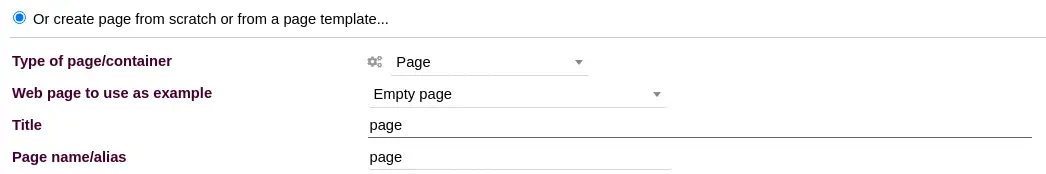 Podemos añadir una página con la opción Or create from scratch or from a page template.... De nuevo introducimos un nombre aleatorio para la página.