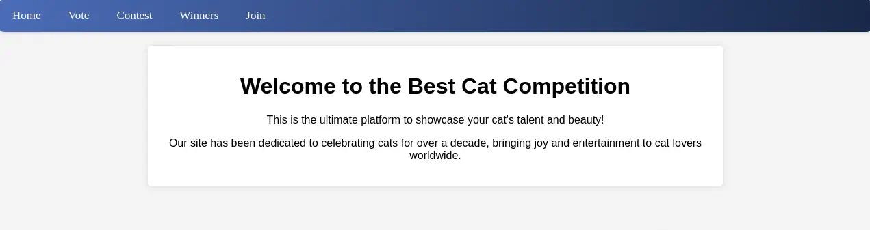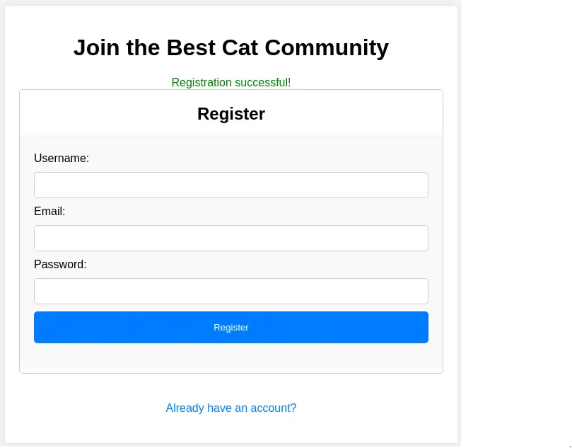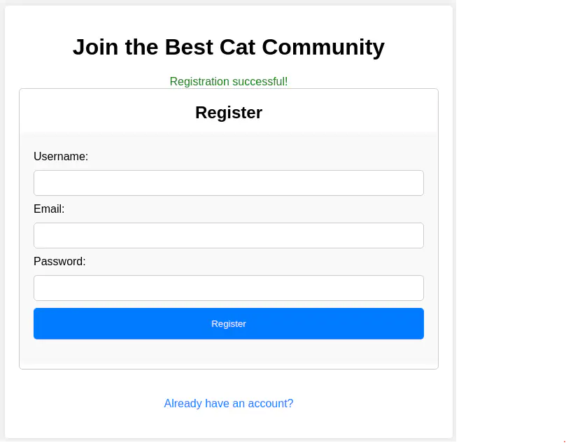 Encontramos una aplicación de competición de gatos en línea. Podemos registrarnos en el sitio web e iniciar sesión si hacemos clic en el botón Join. Iniciamos sesión haciendo clic en Already have an account?.️