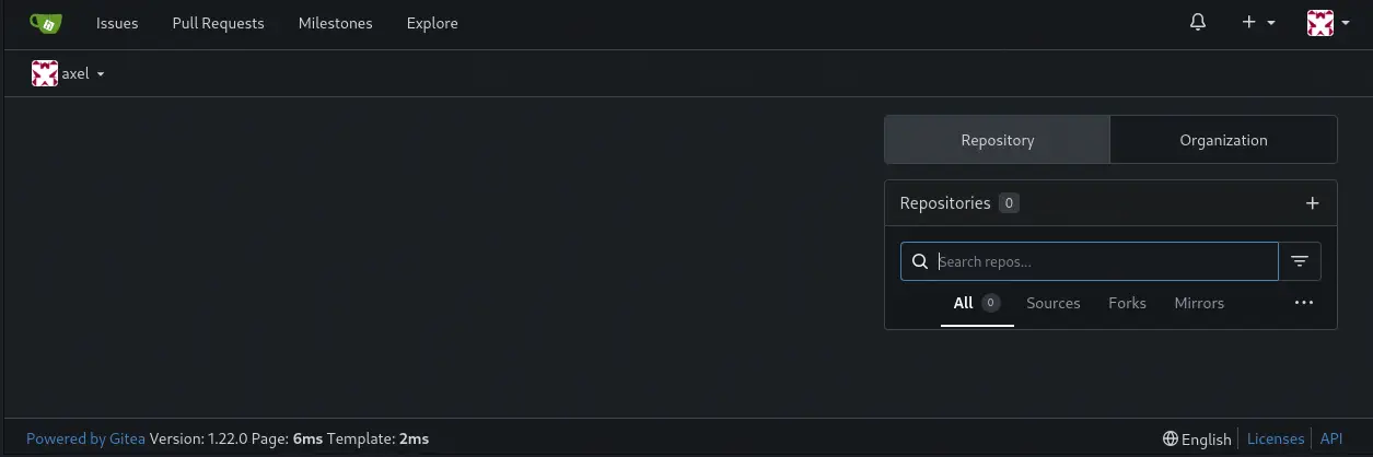 Ahora podemos entrar en la cuenta de axel en el servidor visitando http://127.0.0.1:3000. No se encuentran repositorios.️