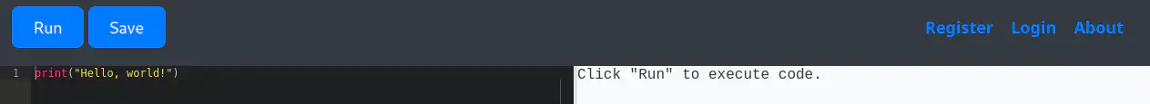 Obtenemos dos servicios: Secure Shell (SSH) y Hypertext Transfer Protocol (HTTP) ejecutados en un sistema operativo Linux Ubuntu. Como no tenemos credenciales factibles para el servicio SSH, vamos a pasar al servicio HTTP. Encontramos una página que ofrece un intérprete de comandos Python. Tenemos la capacidad de crear una cuenta e iniciar sesión, por lo que podría haber cuentas registradas.️
