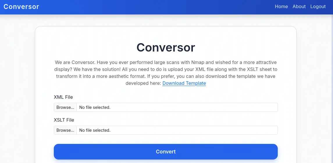 Al abrir la página web encontramos una solicitud de inicio de sesión y un enlace para crear una nueva cuenta para utilizar la aplicación. Creamos la cuenta y encontramos la aplicación Conversor, utilizada para convertir la salida de un escaneo Nmap en formato .xml en un .html utilizando una hoja XSLT con un formato estético. También podemos descargar la plantilla XSLT desde el enlace /static/nmap.xslt.