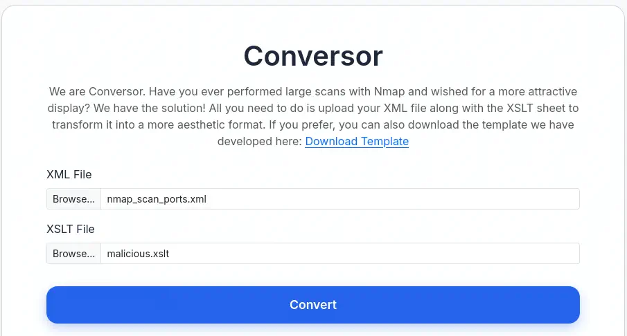 En el punto final /convert, que carga los archivos .xml y .xslt y convierte el archivo al formato .html, encontramos una vulnerabilidad de inyección XSLT ya que el analizador XSLT no incluye ninguna protección contra ataques comunes al utilizar la clase XSLTAccessControl. También encontramos que las contraseñas de los usuarios registrados en la plataforma se guardan en una base de datos utilizando el algoritmo MD5.