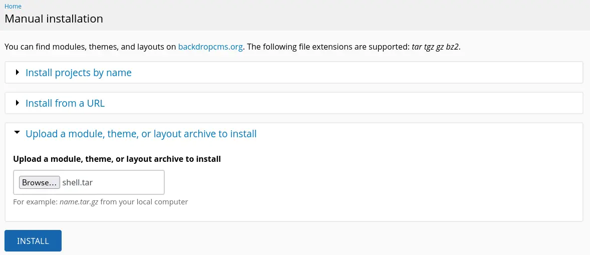 Backdrop es vulnerable a la ejecución de comandos remotos mediante la subida de un plugin malicioso. Podemos generar el paquete utilizando el script encontrado en Exploit-DB. Debido a los requisitos de la instancia, necesitamos empaquetar el archivo .zip a uno .tar ya que el servidor no tiene activado la extensión ZIP.️