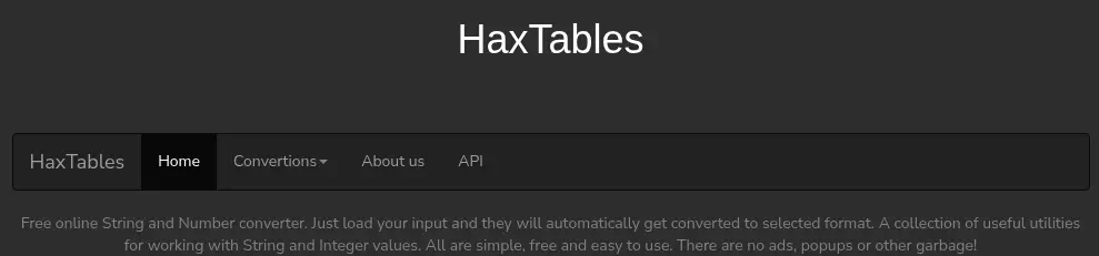 Para la conversión de cadena podemos decodificar Base64, para la conversión de entero podemos convertir Hexadecimal a Decimal, y para la conversión de imagen no hay funcionalidad aún. También tenemos una opción en el menú, API, con documentación sobre la API. El dominio de la API es api.haxtables.htb, así que lo añadimos al archivo /etc/hosts.