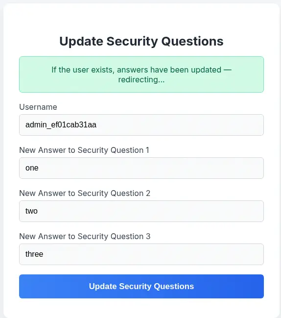 Luego interceptamos la solicitud HTTP con un proxy y usamos la herramienta wfuzz para el ataque de fuerza bruta. Es una solicitud POST al endpoint /security_login.php con los siguientes datos: username=username&answer1=mother&answer2=pet&answer3=city. Encontramos que la respuesta con el nombre de usuario inválido tiene 5378 caracteres.