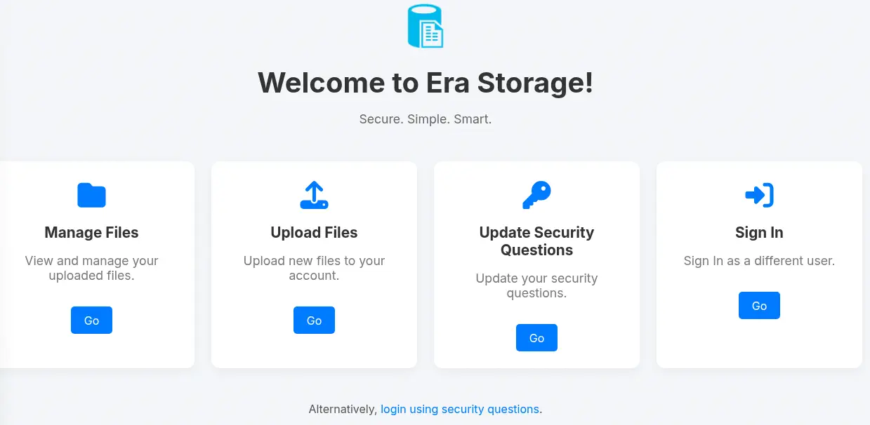Al abrir la página, encontramos la aplicación de Era Storage, una aplicación web creada para subir y descargar archivos. Podemos administrar y subir archivos, actualizar las preguntas de seguridad y iniciar sesión como un usuario. También podemos iniciar sesión utilizando preguntas de seguridad.