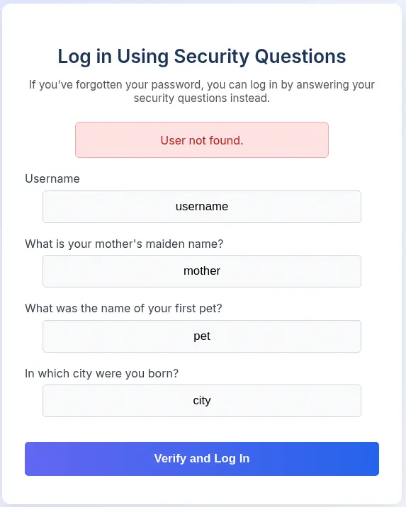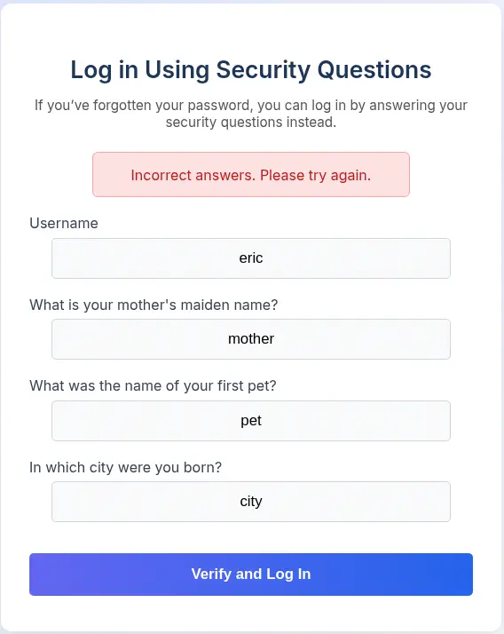 Encontramos cinco usuarios: eric, ethan, john, veronica y yuri. Ahora, por ejemplo, con el usuario eric, si especificamos respuestas aleatorias obtenemos el mensaje Incorrect answers. Please try again..