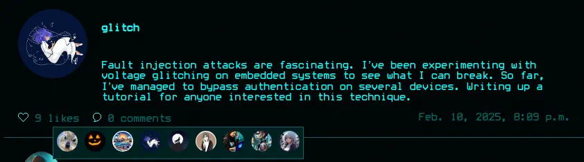 ...<a href="/profile/27"><img src="/media/profile.png" title="<QuerySet [<SocialUser: hexhunter>, <SocialUser: shadowcaster>, <SocialUser: blackhat_wolf>, <SocialUser: glitch>, <SocialUser: codebreaker>, <SocialUser: shadowmancer>, <SocialUser: whitehat>, <SocialUser: brute_force>, <SocialUser: shadowwalker>, <SocialUser: {{ users }}>]>"></a>...