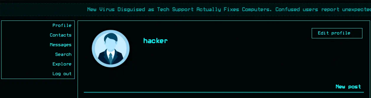 Al abrir el servicio web, encontramos HackNet, una red social completa para hackers en la que podemos iniciar sesión y crear un cuenta. Después de iniciar sesión tenemos una vista en nuestro perfil y podemos crear un nuevo post. Al revisar el código fuente HTML, encontramos el token CSRF csrfmiddlewaretoken. Este nombre corresponde al marco de programación Python Django.