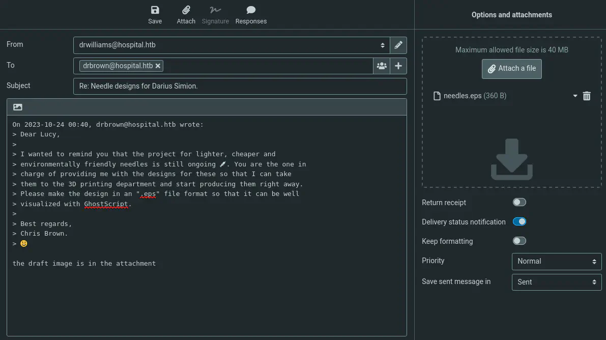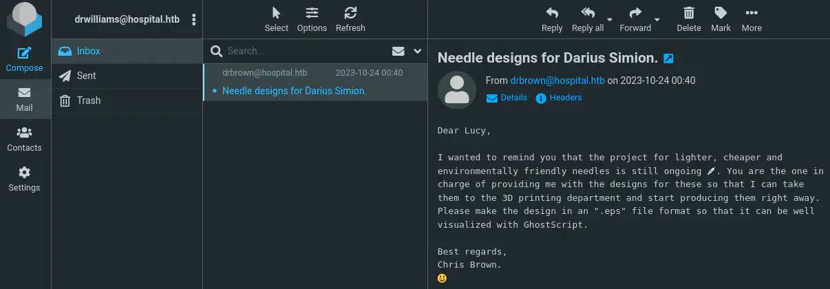 No podemos enumerar la máquina más pero podemos comprobar si la contraseña se reutiliza en el cliente de correo electrónico de Roundcube. Conseguimos acceso al correo electrónico y podemos leer un correo electrónico de otro usuario, drbrown.