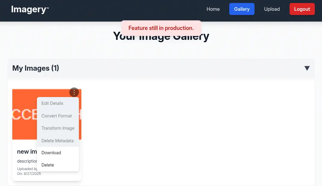 Después de subir la imagen, volvemos a la sección de control o galería y encontramos la imagen cargada con un menú que ofrece varias opciones: Editar Detalles, Convertir Formato, Transformar Imagen, Eliminar Metadatos, Descargar y Eliminar. Solo las últimas dos están funcionando, ya que el sistema indica que la característica está aún en producción.