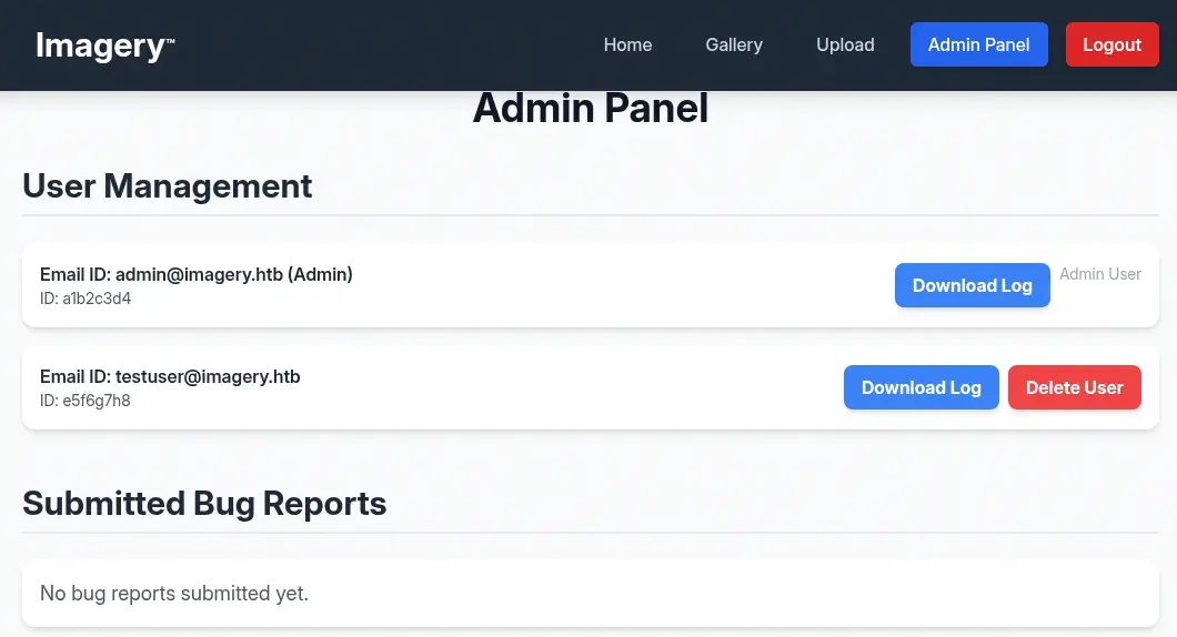 Descubrimos que podemos descargar un registro de sesión de los usuarios registrados en el sistema. Para el usuario registrado como testuser@imagery.htb, encontramos la página http://imagery.htb:8000/admin/get_system_log?log_identifier=testuser%40imagery.htb.log y recibimos el error 404 No Found.