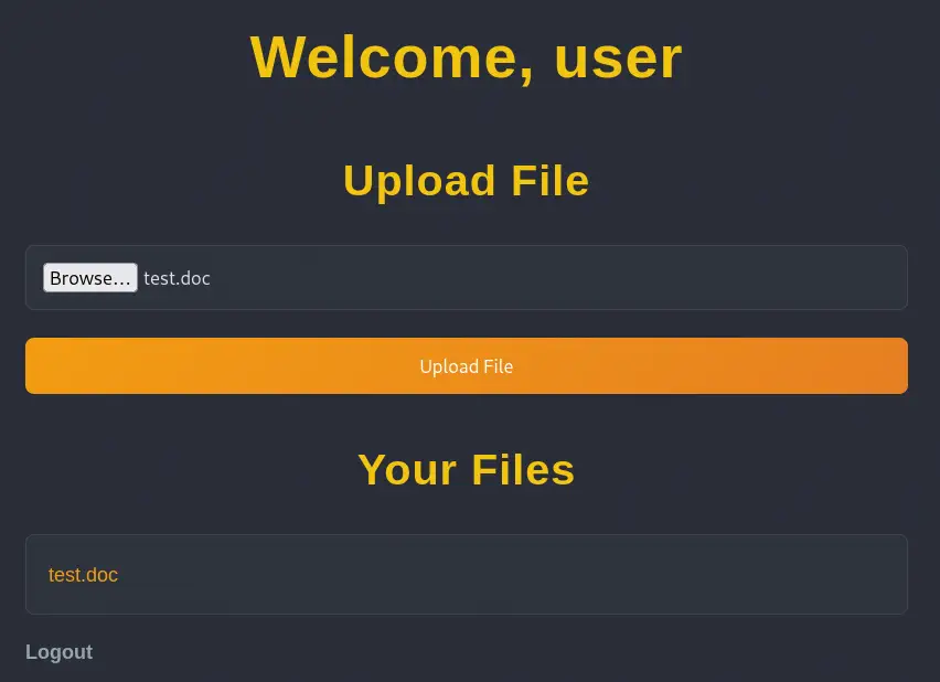 Creamos un nuevo usuario y nos conectamos a la aplicación web. Tenemos la capacidad de subir archivos y la capacidad de salir de la aplicación.️ Intentando subir diferentes tipos de archivos encontramos que se aplica un filtro y solo los archivos pdf, doc, docx, xls, xlsx, odt son permitidos. Por lo tanto creamos y subimos un archivo de documento a la página web, por ejemplo uno creado con OpenOffice. Encontramos que el archivo se subió correctamente y está incluido en la lista de archivos.️