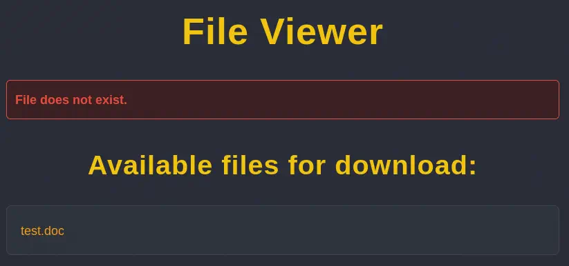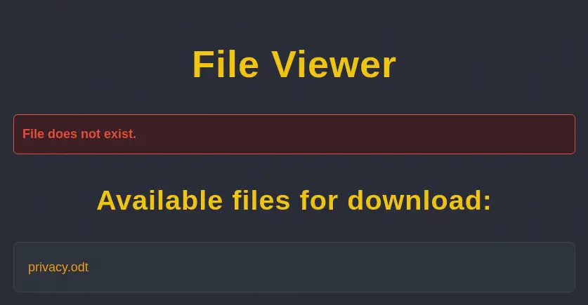 Cuando hacemos clic en el nombre del archivo se nos redirige al enlace http://nocturnal.htb/view.php?username=user&file=test.doc y se descarga el archivo. En los parámetros encontramos los parámetros username y file. Si especificamos un enlace de archivo no existente test.odt, encontramos el mensaje File does not exist y la lista de archivos del usuario.️
