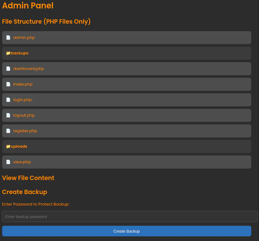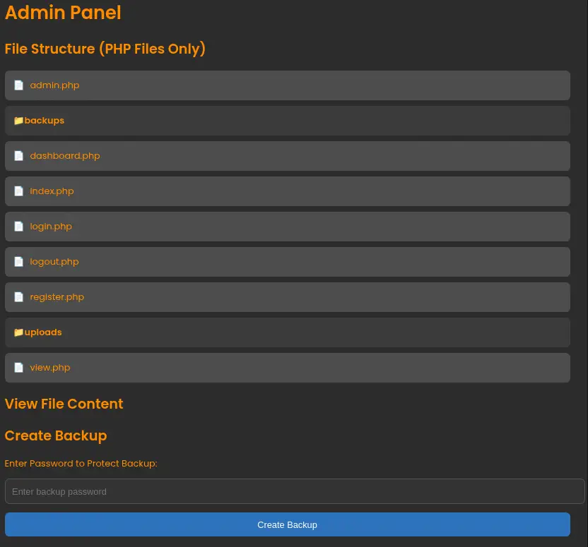 Ahora encontramos un nuevo enlace en la página, Go to Admin Panel que nos redirige a la página del panel del control admin.php. En esta página podemos leer el código fuente de la aplicación y también poder hacer copias de seguridad de los contenidos del servidor web.️