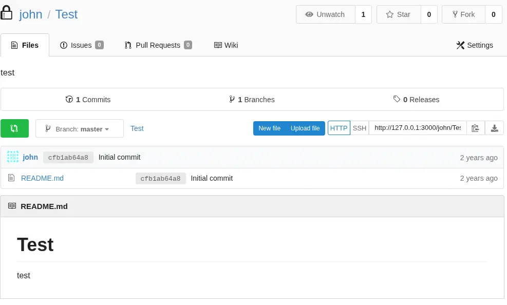 Este comando pip solo está permitido para descargar archivos tarballs desde el servicio Gogs Git. Podemos utilizar las credenciales john en el servicio. Después de iniciar sesión, encontramos un proyecto Test creado. Es privado, por lo que lo cambiaremos a público desde la pestaña Settings.
