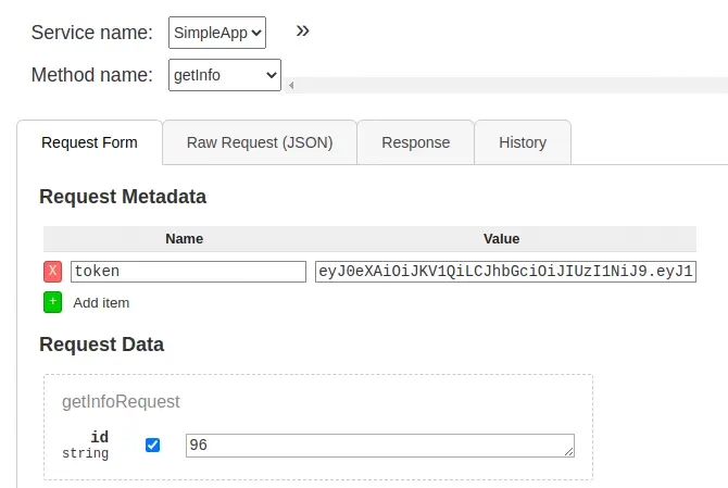 Dentro de la respuesta de inicio de sesión positiva obtenemos un ID y un token. Obtengamos información sobre el ID que hemos asignado. Es necesario especificar el token en el argumento de metadata.