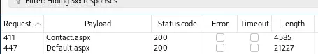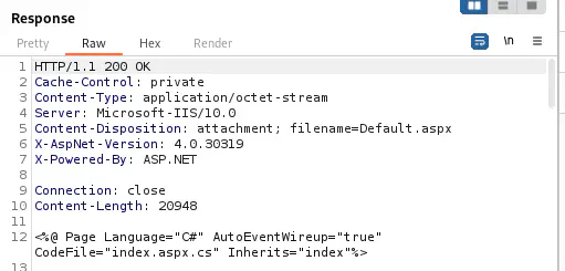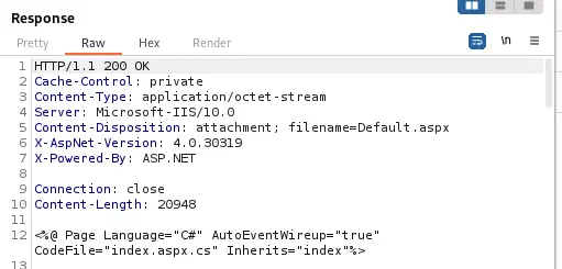 El parámetro file podría ser vulnerable a un Path Traversal o a un LFI. Vamos a pasar al Intruder y vamos a forzar el parámetro con el diccionario iisfinal.txt. Conseguimos una respuesta exitosa, con el archivo Default.aspx.