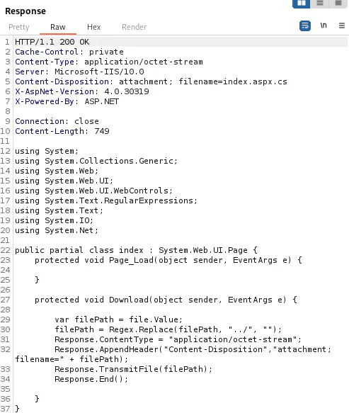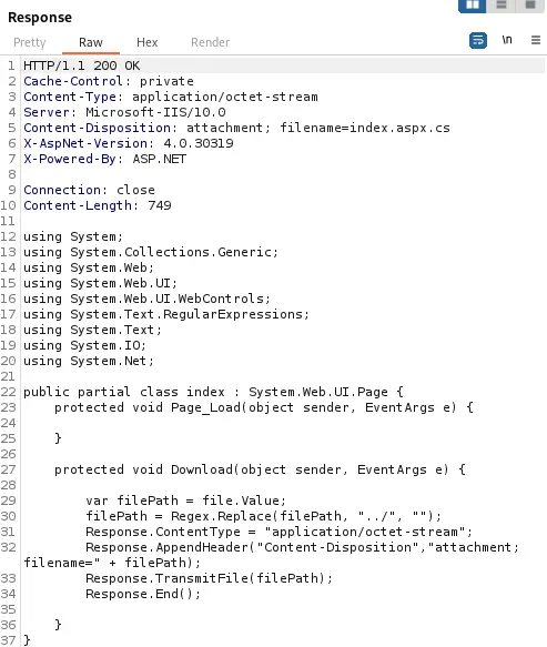 Obtenemos el código fuente del archivo Default.aspx y Contact.aspx. Este archivo contiene el código fuente de la página.