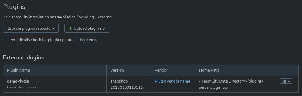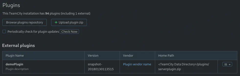 Con los privilegios del administrador en TeamCity, podemos subir un plugin malicioso para ganar la ejecución remota de comandos. Tenemos un guía de kacperszurek. Primero descargamos el plugin malicioso y lo subimos a la aplicación a través del menú Administration > Server Administration > Plugins y el botón Upload plugin zip. Después de la carga se nos solicitará reiniciar el servidor. Lo haremos.