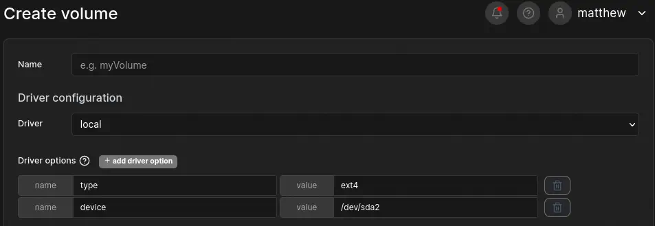 Ahora, en Portainer, vamos a Volumes > Add volume. Como es un dispositivo ext4 añadiremos las opciones del driver type con ext4 y devices con /dev/sda2. Luego creamos el volumen.