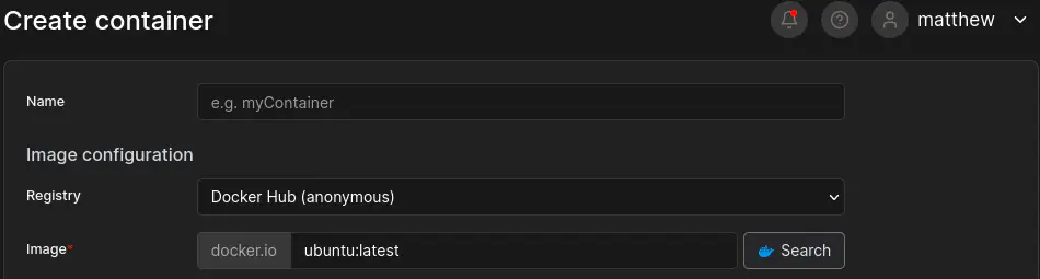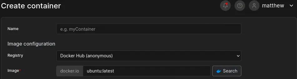 Con el volumen creado creamos el contenedor con permisos de root que tendrá acceso al volumen. Vamos a Containers > Add container. Seleccionamos la imagen ubuntu:latest (está disponible en la pestaña Images).