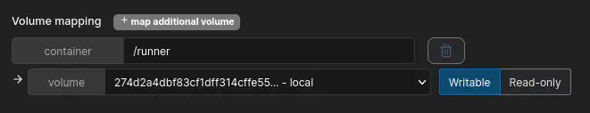 Finalmente, en la pestaña Volumes próxima a Command & Logging vinculamos nuestro volumen pulsando en el botón map additional volume. Con la variable container fijamos la ruta para acceder al volumen desde el contenedor (por ejemplo /runner) y con la variable volume seleccionamos el volumen que hemos creado.