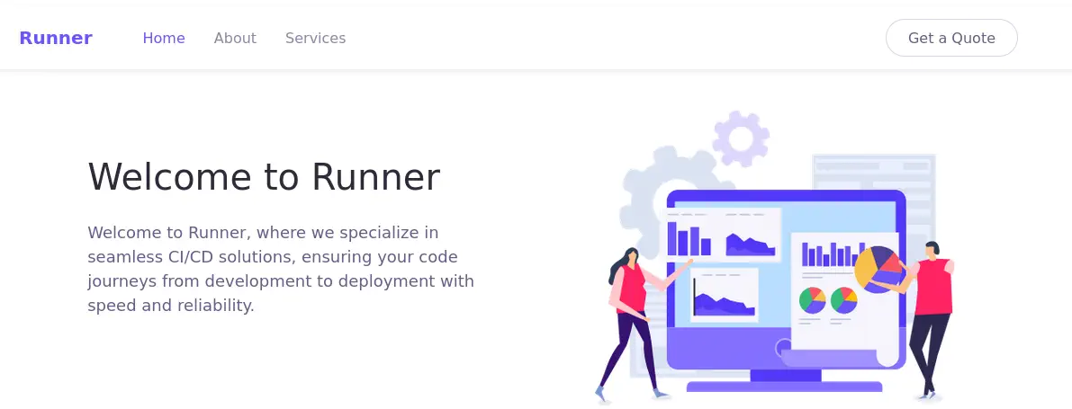 Obtenemos tres servicios: un Secure Shell (SSH) y dos Hypertext Transfer Protocol (HTTP) funcionando en un Linux Ubuntu. Como no tenemos credenciales factibles para el servicio SSH vamos a pasar al servicio HTTP. Observamos que el servicio está hospedando un sitio web, nos redirecciona al dominio runner.htb, por lo que lo agregamos a nuestra lista de /etc/hosts.