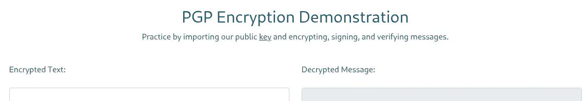 Después del formulario de texto, encontramos el texto Don't know how to use PGP? Check out our guide que nos redirige a la página /guide. En esta página tenemos acceso a la clave pública de la agencia en la ruta /pgp, y las opciones para cifrar, descifrar un mensaje de muestra y verificar una firma.