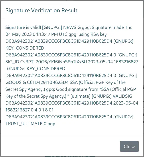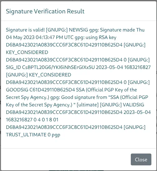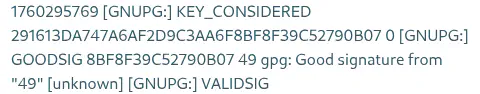 Tenemos un mensaje de vuelta que contiene información sobre la firma, como el ID de la clave, la fecha de la firma, el nombre de la clave PGP, o la fecha de vencimiento de la clave.