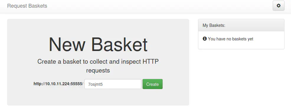 Obtenemos cuatro servicios: Secure Shell (SSH), Hypertext Transfer Protocol (HTTP), y dos servicios desconocidos en un Linux Ubuntu. Como no tenemos credenciales factibles para el servicio SSH vamos a pasar al servicio HTTP en el puerto 55555, ya que los puertos 80 y 8338 están filtrados. Observamos en el navegador que el servicio alberga un sitio web cuya utilidad es trabajar como un almacenador e inspector de solicitudes HTTP, basado en el proyecto request-baskets, versión 1.2.1.