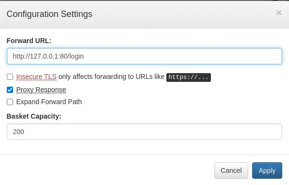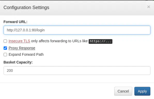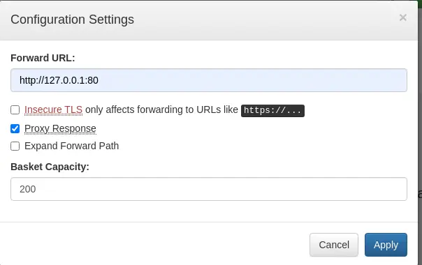 El proyecto es vulnerable a la Falsificación de solicitudes del lado del servicio (SSRF), CVE-2023-27163. La vulnerabilidad permite a los atacantes acceder a los recursos de red y a información confidencial mediante una solicitud de API especial. Cuando creamos una nueva cesta tendremos un ID y un endpoint para enviar las solicitudes a ser guardadas en el almacenador, el endpoint /api/baskets/{id}. Seremos capaces de hacer solicitudes HTTP a un dominio arbitrario y recibir la respuesta de manera similar a un proxy. En la configuración de la cesta podemos especificar una URL avanzada (Forward URL), en este caso, con el puerto no accesible 80 HTTP y comprobar la opción de respuesta del proxy (Proxy Response).