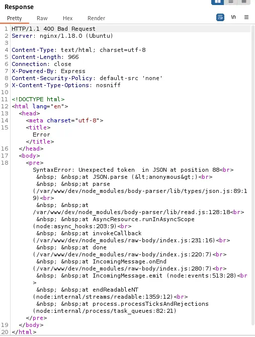 Con el archivo passwd hemos encontrado dos usuarios de consola: root y angoose. Ahora necesitamos identificar el directorio actual, el directorio de ejecución de la aplicación, para buscar archivos que puedan almacenar credenciales. Enviaremos una solicitud inválida al servidor y comprobaremos si tenemos una traza devuelta.